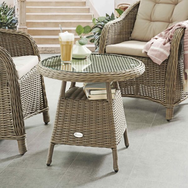 Da ausschließlich wetterfeste Materialien eingesetzt werden, hast Du Möbel, die ganzjährig im Freien gelassen werden. Der Gartentisch „Key West“ wird mit passender Glasplatte geliefert. Das Kunststoffgeflecht ist in traditioneller Handarbeit auf einen stabilen Aluminiumrahmen geflochten.