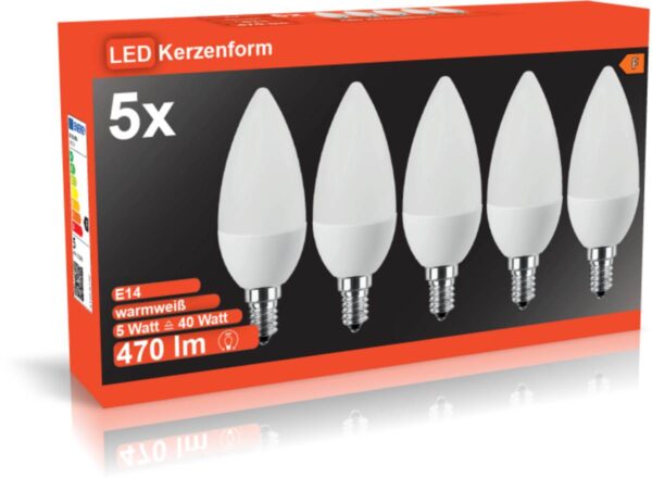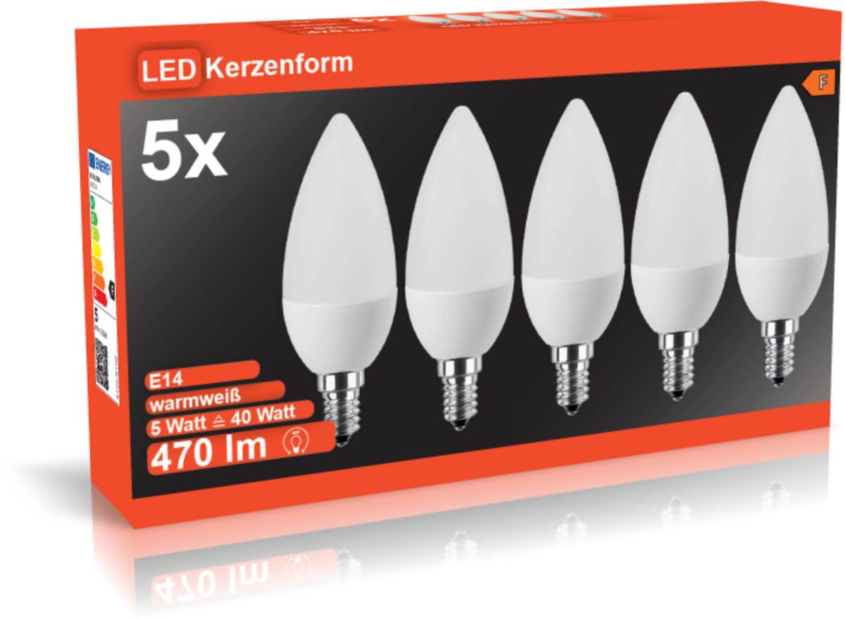 Sockel:E14 Beleuchtungstechnik:LED Energieverbrauch:5 kWh/1000h Schaltzyklen:50.000 Lichtstrom:470 lm Farbtemperatur:2700 K Lichtfarbe:Warmweiß Farbwiedergabeindex:80 Anzahl pro Packung:5 Produktabmesungen (H x B x T):103 x 35 x 35 mm Lebensdauer:10.000 h Energieeffizienzklasse:F Betriebstemperatur:-20 bis +40 C° Lagertemperatur:-30 bis +40 C° Leistungsaufnahme:5 W Schutzart:IP20 Dimmbar:Nein EAN:4260293204660 Artikelnummer:49224  Lieferumfang