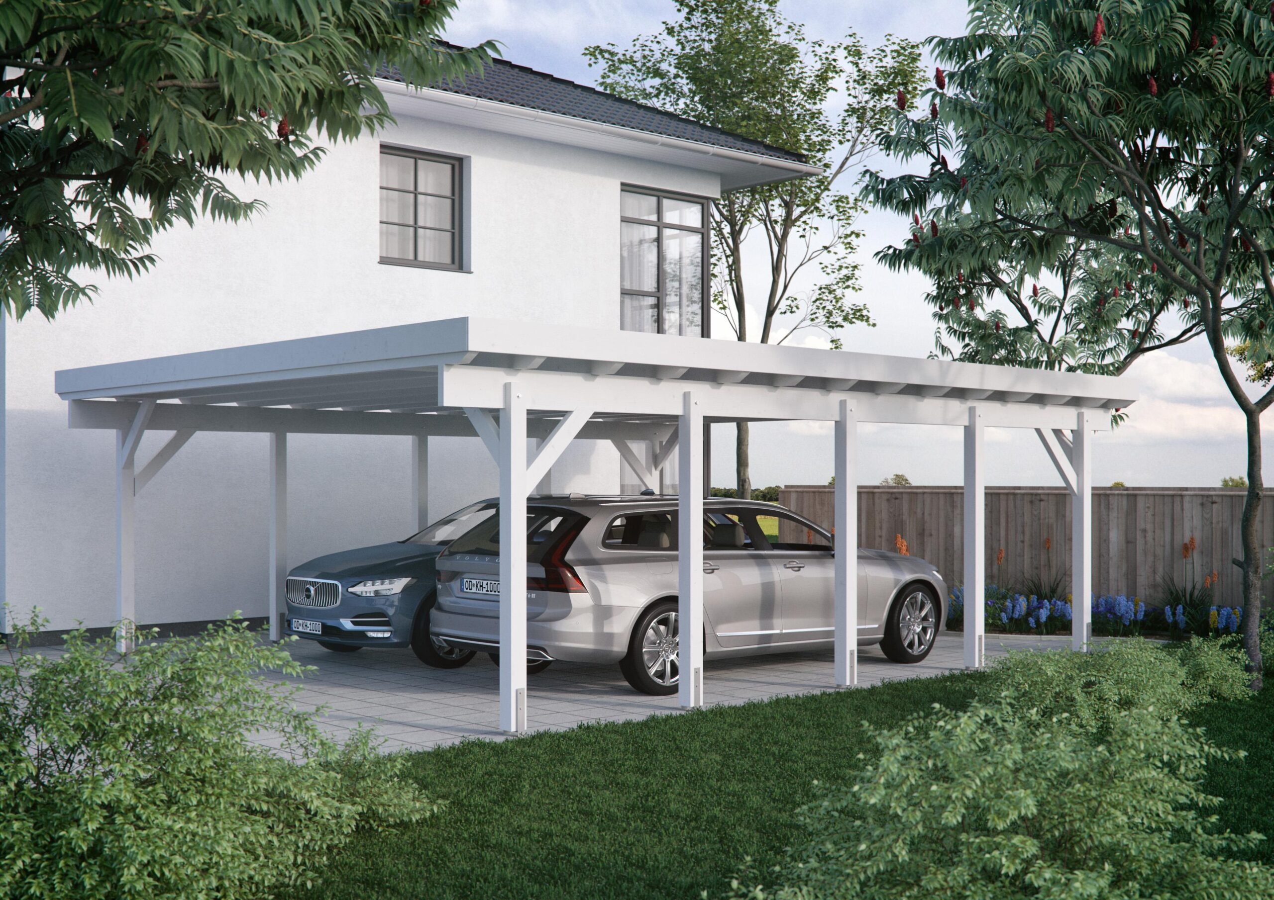 Der Carport ist farbvorbehandelt wahlweise in weiß oder anthrazit. Es zeigt sich in schickem und schlicht elegantem Stil. Genug Platz um noch ein Geräteraum zu integrieren für alle Gartengeräte oder Fahrräder. Ihr Garten ist somit schnell befreit von allen Dingen, die nur so herumstehen. Das Design zeigt, dass Großzügigkeit vereinbar ist mit Eleganz. Die Qualität ist geprägt vom hartem finnischem Fichte-Lamellen-Holz. Spezial-Antikkondens-Dachprofile, feuerverzinkt, schützen der Carport zusätzlich. Die Schneelast ist mit 250 kg/m² besonders hoch.