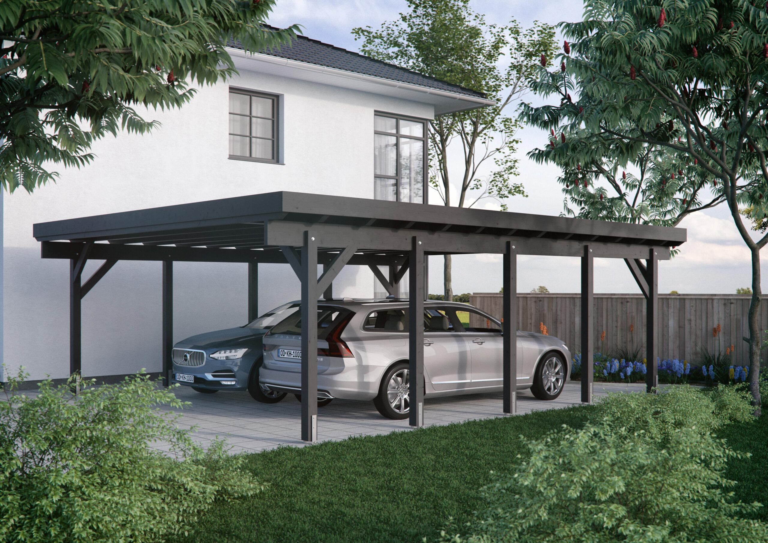 Der Carport ist farbvorbehandelt wahlweise in weiß oder anthrazit. Es zeigt sich in schickem und schlicht elegantem Stil. Genug Platz um noch ein Geräteraum zu integrieren für alle Gartengeräte oder Fahrräder. Ihr Garten ist somit schnell befreit von allen Dingen, die nur so herumstehen. Das Design zeigt, dass Großzügigkeit vereinbar ist mit Eleganz. Die Qualität ist geprägt vom hartem finnischem Fichte-Lamellen-Holz. Spezial-Antikkondens-Dachprofile, feuerverzinkt, schützen der Carport zusätzlich. Die Schneelast ist mit 250 kg/m² besonders hoch.
