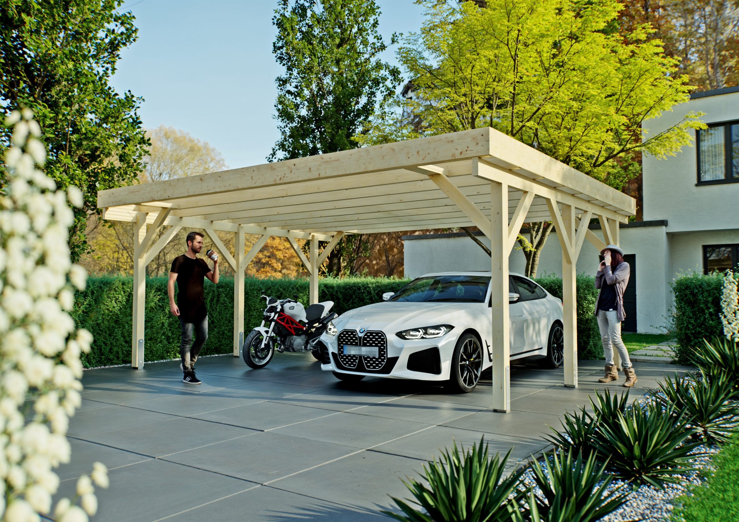 Wir bieten Ihnen eine hochwertige und langlebige Lösung für Ihr Fahrzeug. Durch die Verwendung von Fichten Leimholz sind unsere Carports besonders stabil und widerstandsfähig gegenüber Witterungseinflüssen.Unsere unbehandelten Carports ermöglichen es Ihnen, Ihre individuellen Gestaltungswünsche umzusetzen. Sie können den Carport nach Belieben streichen oder lasieren und somit an Ihre persönlichen Vorlieben anpassen. Dadurch wird Ihr Carport zu einem echten Blickfang in Ihrem Garten.Dank der hochwertigen Verarbeitung und des robusten Materials bieten unsere Carports einen optimalen Schutz für Ihr Fahrzeug. Egal ob Regen, Schnee oder Sonne – Ihr Auto ist sicher vor den Elementen geschützt.Zusätzlich bieten wir verschiedene Optionen für die Bedachung an, darunter zum Beispiel umweltfreundlichen PET-Profilplatten, robuste Stahlplatten oder hochwertige EPDM-Dachsysteme. Je nach Ihren individuellen Vorlieben und Anforderungen können Sie die passende Bedachung für Ihren Carport auswählen.Die Montage unserer Carports ist einfach und unkompliziert. Mit der mitgelieferten Anleitung können Sie Ihren Carport schnell und problemlos aufbauen. Sollten Sie dennoch Fragen haben, steht Ihnen unser Kundenservice gerne zur Verfügung.