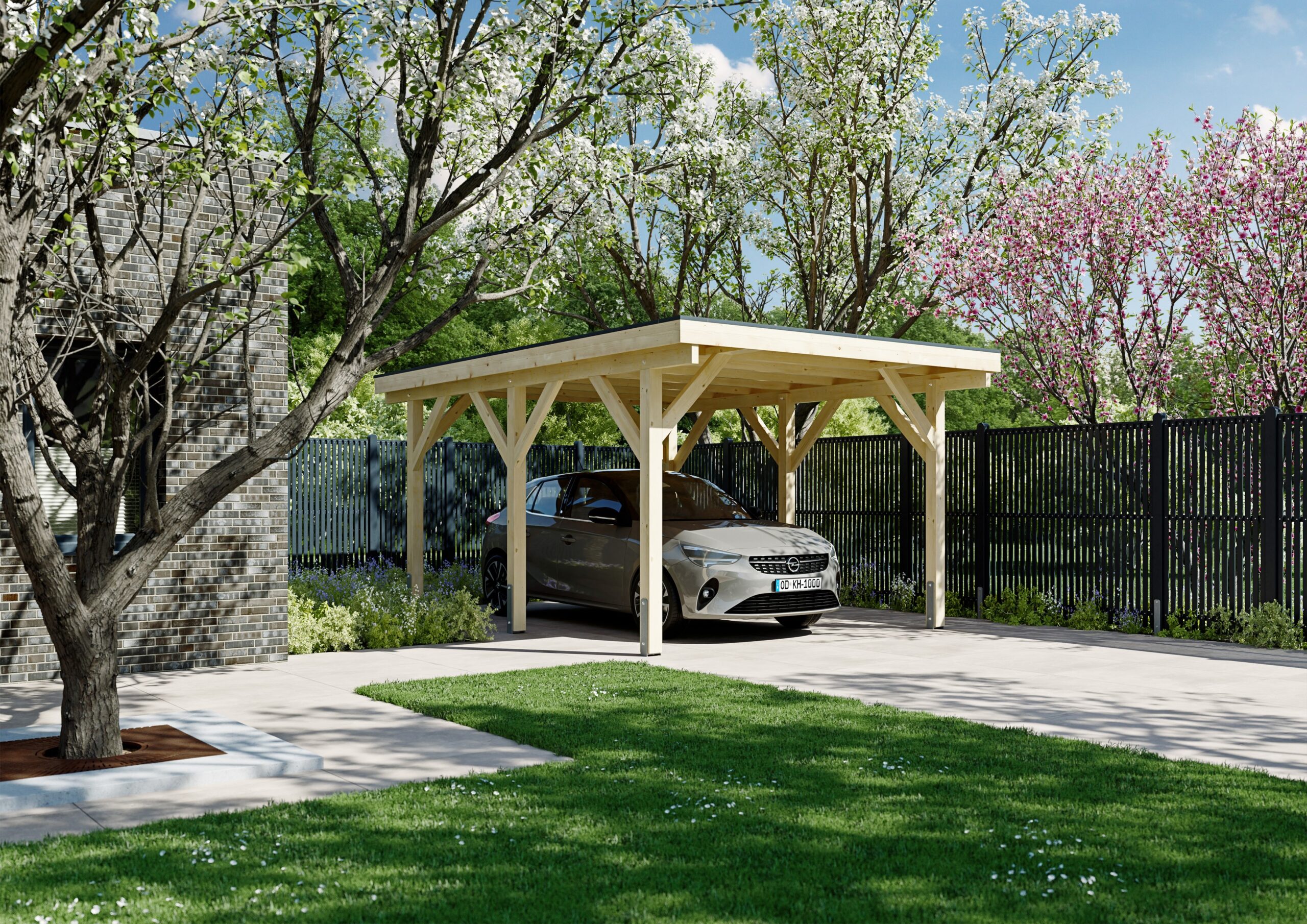 Wir bieten Ihnen eine hochwertige und langlebige Lösung für Ihr Fahrzeug. Durch die Verwendung von Fichten Leimholz sind unsere Carports besonders stabil und widerstandsfähig gegenüber Witterungseinflüssen.Unsere unbehandelten Carports ermöglichen es Ihnen, Ihre individuellen Gestaltungswünsche umzusetzen. Sie können den Carport nach Belieben streichen oder lasieren und somit an Ihre persönlichen Vorlieben anpassen. Dadurch wird Ihr Carport zu einem echten Blickfang in Ihrem Garten.Dank der hochwertigen Verarbeitung und des robusten Materials bieten unsere Carports einen optimalen Schutz für Ihr Fahrzeug. Egal ob Regen, Schnee oder Sonne – Ihr Auto ist sicher vor den Elementen geschützt.Zusätzlich bieten wir verschiedene Optionen für die Bedachung an, darunter zum Beispiel umweltfreundlichen PET-Profilplatten, robuste Stahlplatten oder hochwertige EPDM-Dachsysteme. Je nach Ihren individuellen Vorlieben und Anforderungen können Sie die passende Bedachung für Ihren Carport auswählen.Die Montage unserer Carports ist einfach und unkompliziert. Mit der mitgelieferten Anleitung können Sie Ihren Carport schnell und problemlos aufbauen. Sollten Sie dennoch Fragen haben, steht Ihnen unser Kundenservice gerne zur Verfügung.