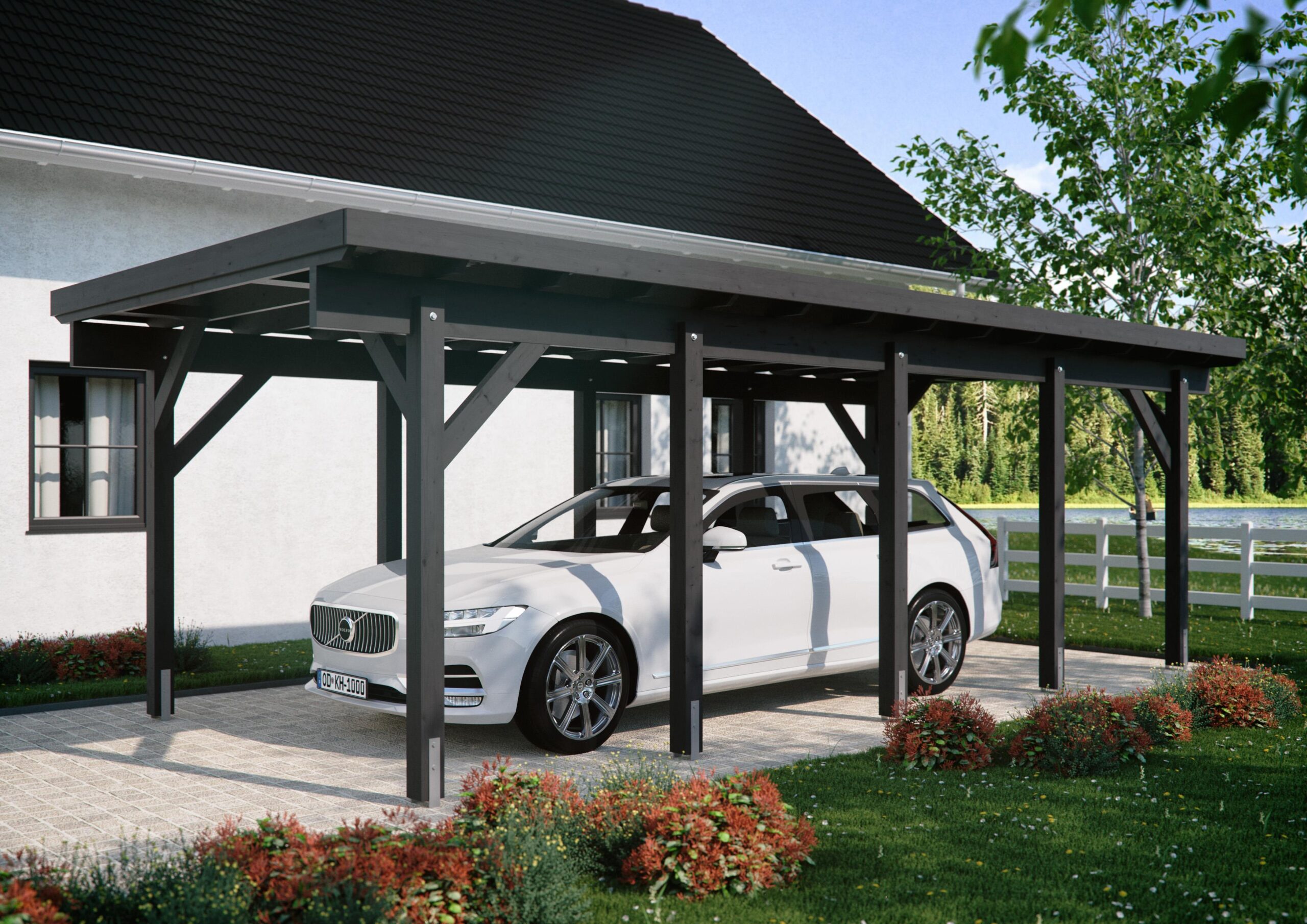 Der Carport ist farbvorbehandelt wahlweise in weiß oder anthrazit. Es zeigt sich in schickem und schlicht elegantem Stil. Genug Platz um noch ein Geräteraum zu integrieren für alle Gartengeräte oder Fahrräder. Ihr Garten ist somit schnell befreit von allen Dingen, die nur so herumstehen. Das Design zeigt, dass Großzügigkeit vereinbar ist mit Eleganz. Die Qualität ist geprägt vom hartem finnischem Fichte-Lamellen-Holz. Spezial-Antikkondens-Dachprofile, feuerverzinkt, schützen der Carport zusätzlich. Die Schneelast ist mit 250 kg/m² besonders hoch.
