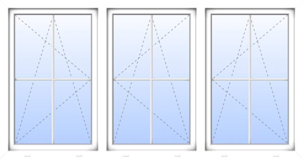 ‚3-flügeliges PVC Fenster 2-fach verglast symmetrisch Dreh-Kipp / Dreh-Kipp – Profil GEALAN S 8000 – Maße Breite: 180 cm bis 300 cm und Höhe: 50 cm bis 170 cm – Wärmedämmwert = 1,10 W/m²K – Mehrfach Pilzkopfverriegelung – Farben: Weiß, Anthrazitgrau oder Silbergrau und Holzdekore: Golden Oak oder Mahagoni – Glasarten Mastercarré-Glas, Klarglas, Ornamentglas 504, Satinato (Milchglas) oder Chinchilla‘