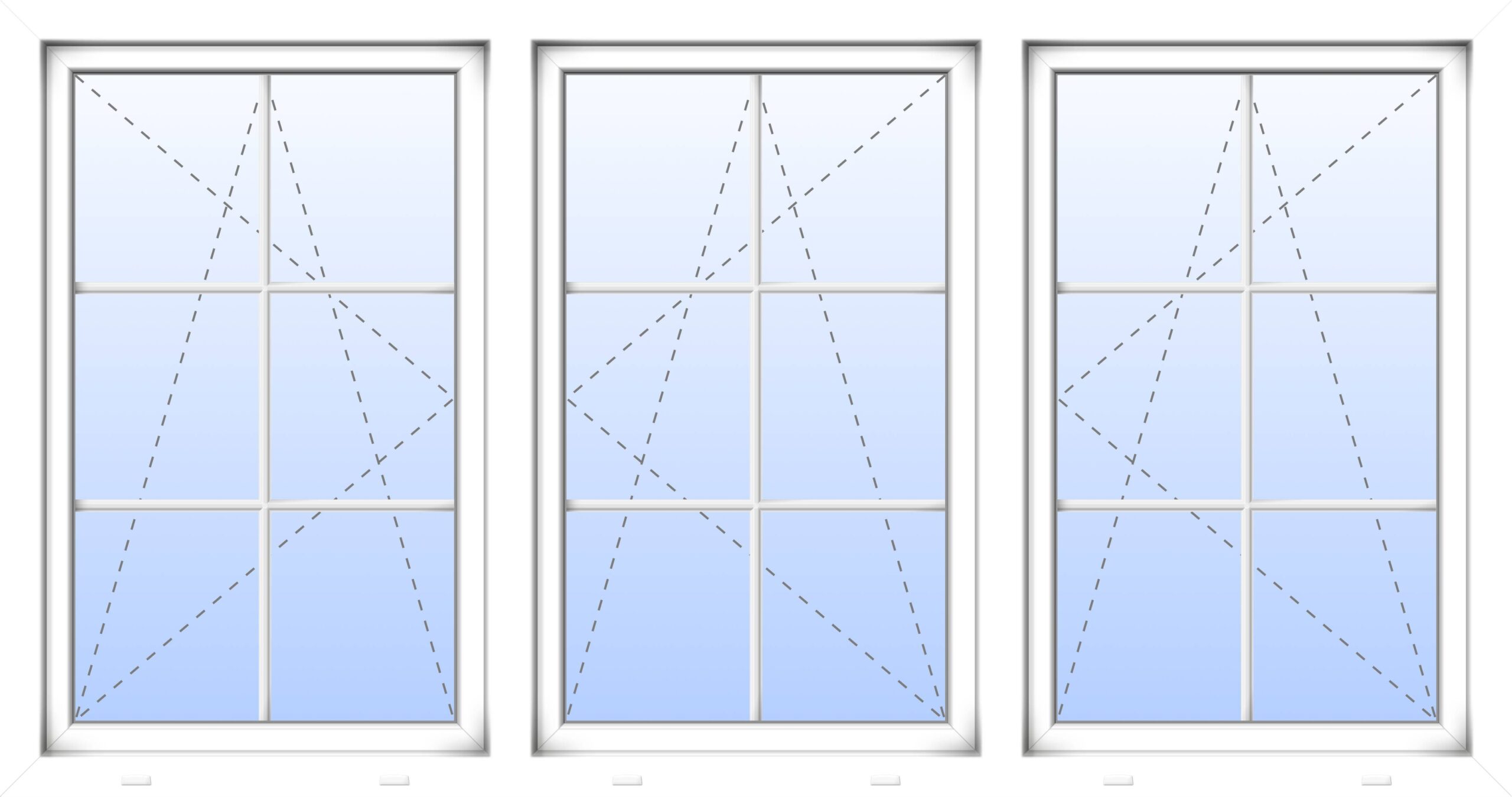 ‚3-flügeliges PVC Fenster 2-fach verglast symmetrisch Dreh-Kipp / Dreh-Kipp – Profil GEALAN S 8000 – Maße Breite: 180 cm bis 300 cm und Höhe: 50 cm bis 170 cm – Wärmedämmwert = 1,10 W/m²K – Mehrfach Pilzkopfverriegelung – Farben: Weiß, Anthrazitgrau oder Silbergrau und Holzdekore: Golden Oak oder Mahagoni – Glasarten Mastercarré-Glas, Klarglas, Ornamentglas 504, Satinato (Milchglas) oder Chinchilla‘