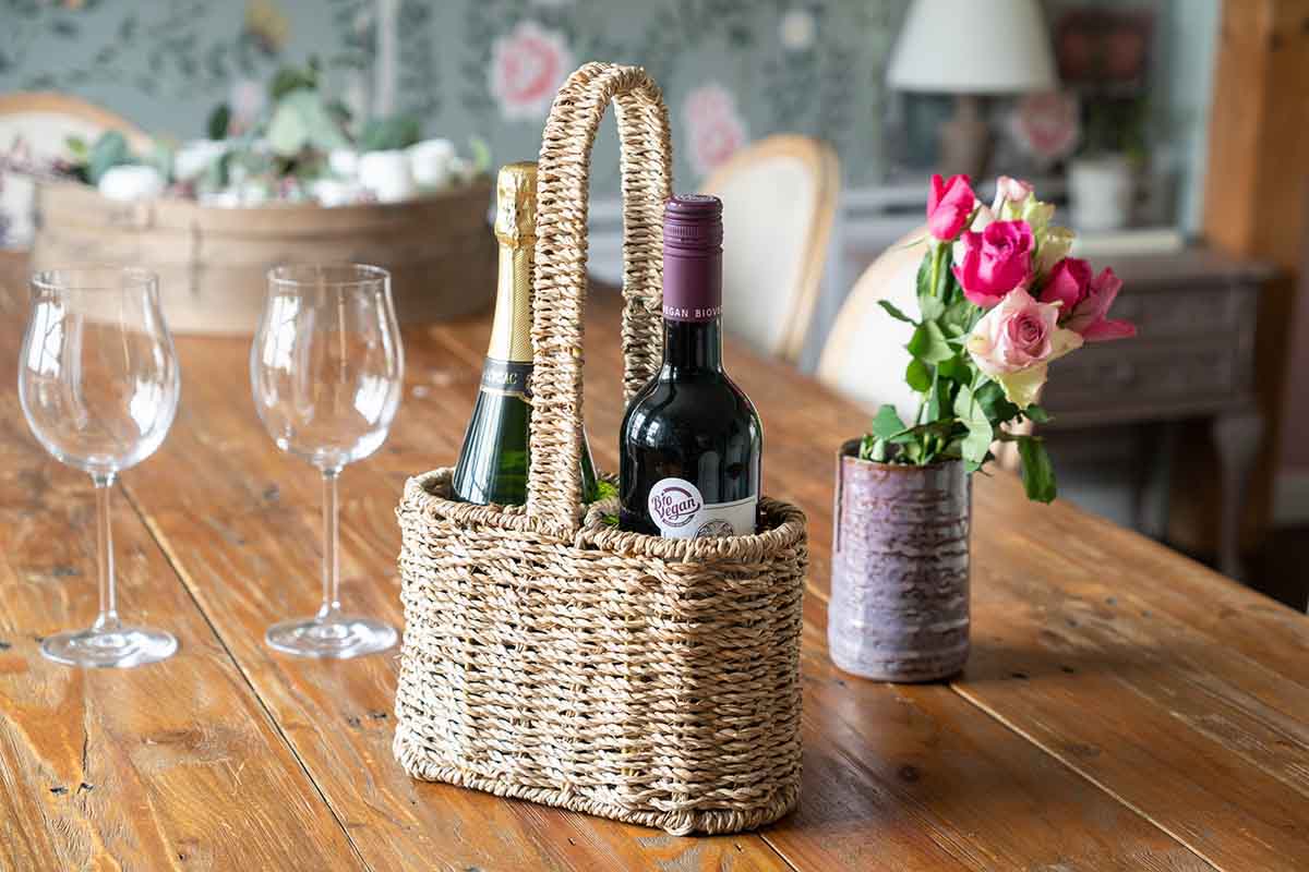 </b></div><div>In diesem Flaschenträger aus geflochtenem Seegras können Sie 2 Flaschen einfach transportieren, dekorativ präsentieren oder aufbewahren. Servieren Sie Rotwein und Weißwein oder zwei verschiedene Rebsorten mit diesem Flaschenkorb. Oder wie wäre es mit Champagner, Sekt, Rosé-Sekt oder Prosecco? Eine andere Möglichkeit ist es, beim Sektempfang den Korb als Flaschenträger zu nutzen – für Sekt und für Orangensaft. Sie sehen, es gibt viele Ideen, wie Sie diesen Korb für 2 Flaschen verwenden können.