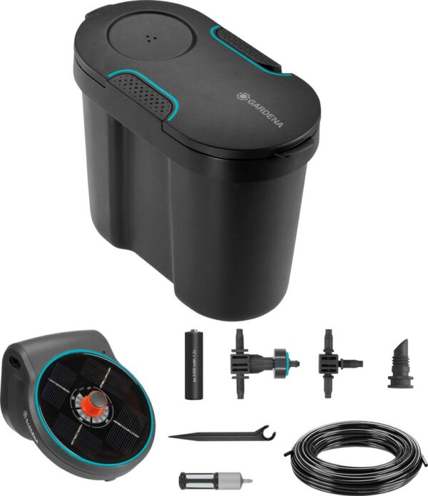 Gardena AquaBloom Komplett-Set mit Wasserbehälter, 14 Bewässerungsprogramme, solarbetrieben