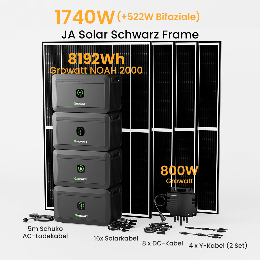 Wichtig: In diesem Angebot wird davon ausgegangen, dass Sie gemäß § 12 Abs. 3 UStG berechtigt sind, das angebotene Produkt zu einem reduzierten MwSt.-Satz von 0 % zu erwerben. Bitte beachten Sie, dass dieser reduzierte Mehrwertsteuersatz nur für Endkunden (C-Endkunden) gilt. Für Geschäftskunden (B-Endkunden) behalten wir uns das Recht vor, Ihnen im Nachhinein eine Rechnung mit dem regulären MwSt.-Satz von 19 % per E-Mail zuzustellen.. Sofort lieferbar – In 7-14 Tagen bei Ihnen Zuhause. Growatt NOAH 2000 Solarspeicher:. 2048Wh (Bis zu 8192Wh), 1800W PV-Eingangsleistung. Fernüberwachung und -steuerung über App. Hochwertige LiFePO4-Batterie, 6000 Ladezyklen. Schnelle und einfache Installation. Robuste Bauweise mit IP66-Schutzklasse. Das Set beinhaltet:. 1-4x Growatt NOAH 2000 Solarspeicher. 2-4x JA Solar Bifaziale Solarmodule (435 Black Frame/440 Full Black). 1x Growatt NEO 800W Mikro-Wechselrichter. 4-16x Solarkabel. 2-8x DC-Kabel. 1x 5m AC-Ladekabel. 4 (2 Set) x Y-Kabel (nur für 4 Solarmodule Sets)