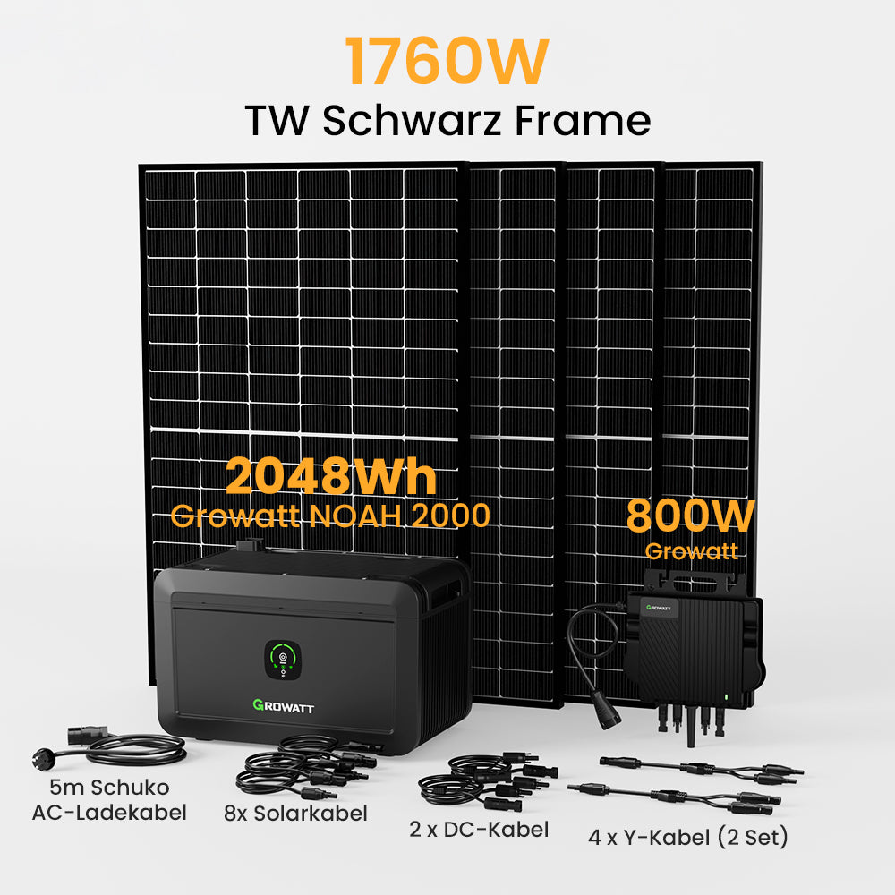 Wichtig: In diesem Angebot wird davon ausgegangen, dass Sie gemäß § 12 Abs. 3 UStG berechtigt sind, das angebotene Produkt zu einem reduzierten MwSt.-Satz von 0 % zu erwerben. Bitte beachten Sie, dass dieser reduzierte Mehrwertsteuersatz nur für Endkunden (C-Endkunden) gilt. Für Geschäftskunden (B-Endkunden) behalten wir uns das Recht vor, Ihnen im Nachhinein eine Rechnung mit dem regulären MwSt.-Satz von 19 % per E-Mail zuzustellen.. Sofort lieferbar – In 7-14 Tagen bei Ihnen Zuhause. Growatt NOAH 2000 Solarspeicher:. 2048Wh (Bis zu 8192Wh), 1800W PV-Eingangsleistung. Fernüberwachung und -steuerung über App. Hochwertige LiFePO4-Batterie, 6000 Ladezyklen. Schnelle und einfache Installation. Robuste Bauweise mit IP66-Schutzklasse. Das Set beinhaltet:. 1-4x Growatt NOAH 2000 Solarspeicher. 2-4x TW 440W Black Frame Solarmodule. 1x Growatt NEO 800W Mikro-Wechselrichter. 4-16x Solarkabel. 2-8x DC-Kabel. 1x 5m AC-Ladekabel. 4 (2 Set) x Y-Kabel (nur für 4 Solarmodule Sets)