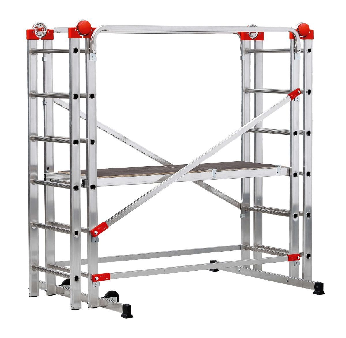 • Multifunktion: Verwendung als Anlege- und Doppelleiter, als kleines Gerüst für den Innen- und Außenbereich oder als Arbeitsbühne