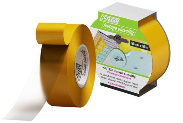 Das Klebeband “ICUTEC Icutape einseitig” wird eingesetzt um Dampfbremsfolien und Dampfsperrfolien im Bereich der Tackerstellen und Falten luftdicht zu verkleben. Der Einsatz des “ICUTEC Icutape einseitig” ist universell in den Gewerken Steildach, Flachdach und Trockenbau möglich.