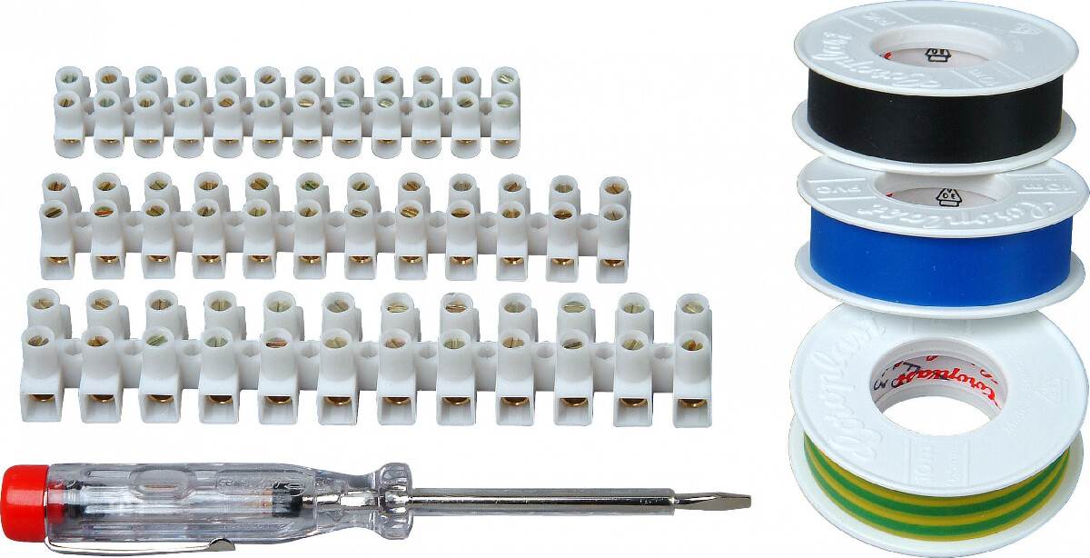 Elektro-Installations-Set: 1 x Spannungsprüfer, 1 x Lüsterklemmleiste (12x 2,5mm², 6mm² und 10mm²), 3 x Isolierband