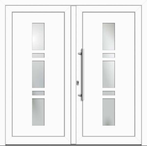 ‚Kunststoff Haustür „CHRISTA“ 71 mm Doppeltür symm – Die perfekte Eingangstür für moderne Hauseingänge. Die weiße Doppeltür kann cm-genau nach Maß gefertigt werden und eignet sich somit für wirklich jedes Bauprojekt. Ausgestattet mit einer 5-fach Rollzapfenverriegelung oder 5-fach Pilzkopfverriegelung und Aushebelsicherung ist der Eingang zuverlässig abgesichert. Dank der Öffnung nach außen oder innen sind Sie flexibel im Einsatz und können zusätzlichen Stauraum schaffen. Die zweiflügelige Kunststofftür wird ohne Mittelsteg gerfertigt. Das sorgt für die Nutzung der vollen Breite und ermöglicht es die Tür mit Fahrzeugen zu passieren.‘