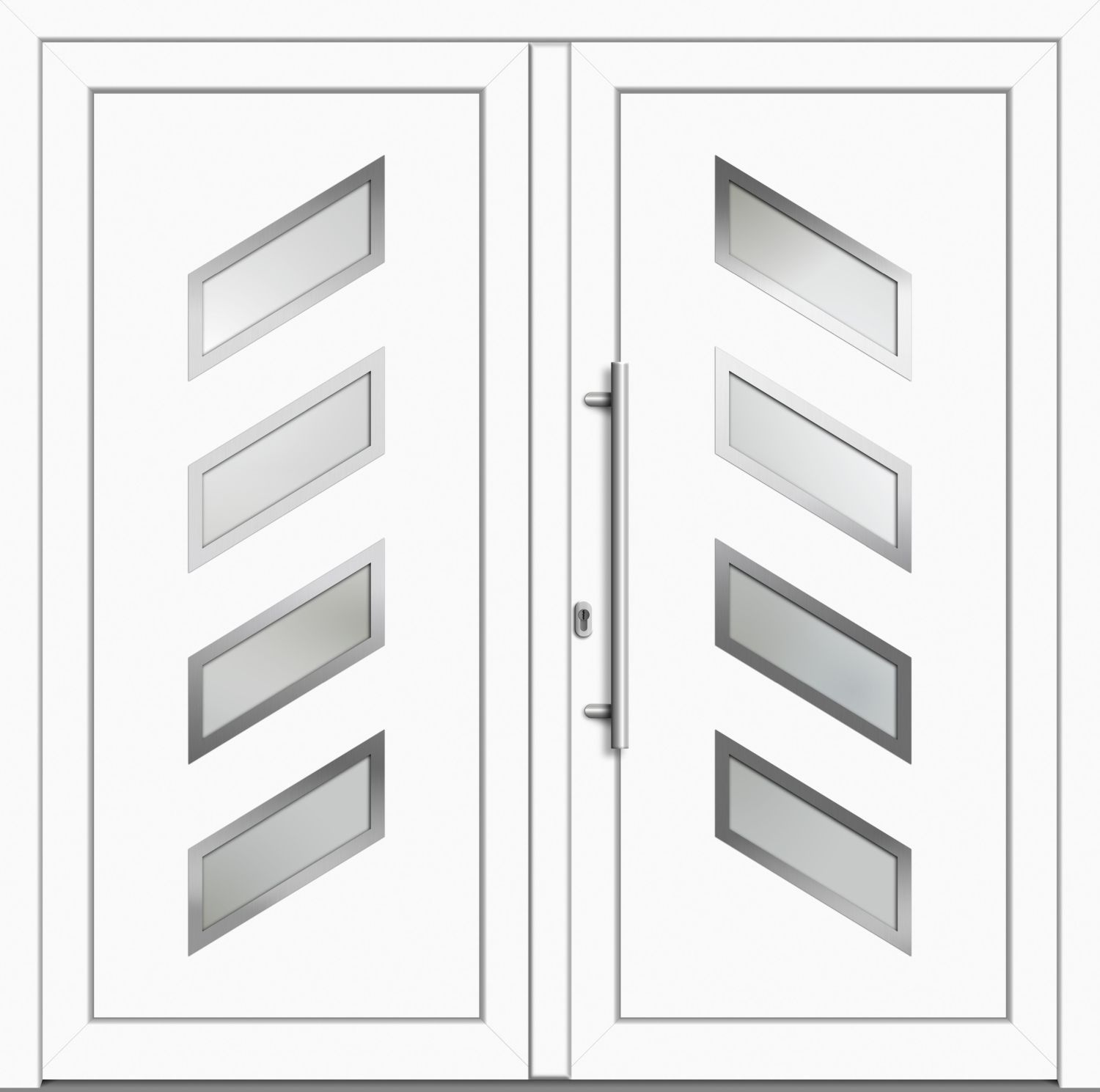‚Kunststoff Haustür „ELLEN“ 71 mm Doppeltür symmetrisch – Die perfekte Eingangstür für moderne Hauseingänge. Die weiße Doppeltür kann cm-genau nach Maß gefertigt werden und eignet sich somit für wirklich jedes Bauprojekt. Ausgestattet mit einer 5-fach Rollzapfenverriegelung oder 5-fach Pilzkopfverriegelung und Aushebelsicherung ist der Eingang zuverlässig abgesichert. Dank der Öffnung nach außen oder innen sind Sie flexibel im Einsatz und können zusätzlichen Stauraum schaffen. Die zweiflügelige Kunststofftür wird ohne Mittelsteg gerfertigt. Das sorgt für die Nutzung der vollen Breite und ermöglicht es die Tür mit Fahrzeugen zu passieren. Der moderne Charakter wird durch Edelstahl-Applikationen unterstrichen!‘
