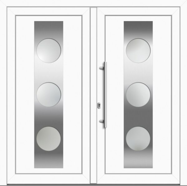 ‚Kunststoff Haustür „LAIANA“ 71 mm Doppeltür symm – Die perfekte Eingangstür für moderne Hauseingänge. Die weiße Doppeltür kann cm-genau nach Maß gefertigt werden und eignet sich somit für wirklich jedes Bauprojekt. Ausgestattet mit einer 5-fach Rollzapfenverriegelung oder 5-fach Pilzkopfverriegelung und Aushebelsicherung ist der Eingang zuverlässig abgesichert. Dank der Öffnung nach außen oder innen sind Sie flexibel im Einsatz und können zusätzlichen Stauraum schaffen. Die zweiflügelige Kunststofftür wird ohne Mittelsteg gerfertigt. Das sorgt für die Nutzung der vollen Breite und ermöglicht es die Tür mit Fahrzeugen zu passieren. Der moderne Charakter wird durch Edelstahl-Applikationen unterstrichen!‘