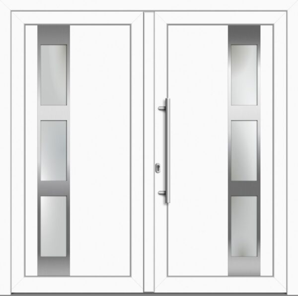 ‚Kunststoff Haustür „LAURETTE“ 71 mm Doppeltür symm – Die perfekte Eingangstür für moderne Hauseingänge. Die weiße Doppeltür kann cm-genau nach Maß gefertigt werden und eignet sich somit für wirklich jedes Bauprojekt. Ausgestattet mit einer 5-fach Rollzapfenverriegelung oder 5-fach Pilzkopfverriegelung und Aushebelsicherung ist der Eingang zuverlässig abgesichert. Dank der Öffnung nach außen oder innen sind Sie flexibel im Einsatz und können zusätzlichen Stauraum schaffen. Die zweiflügelige Kunststofftür wird ohne Mittelsteg gerfertigt. Das sorgt für die Nutzung der vollen Breite und ermöglicht es die Tür mit Fahrzeugen zu passieren. Der moderne Charakter wird durch Edelstahl-Applikationen unterstrichen!‘