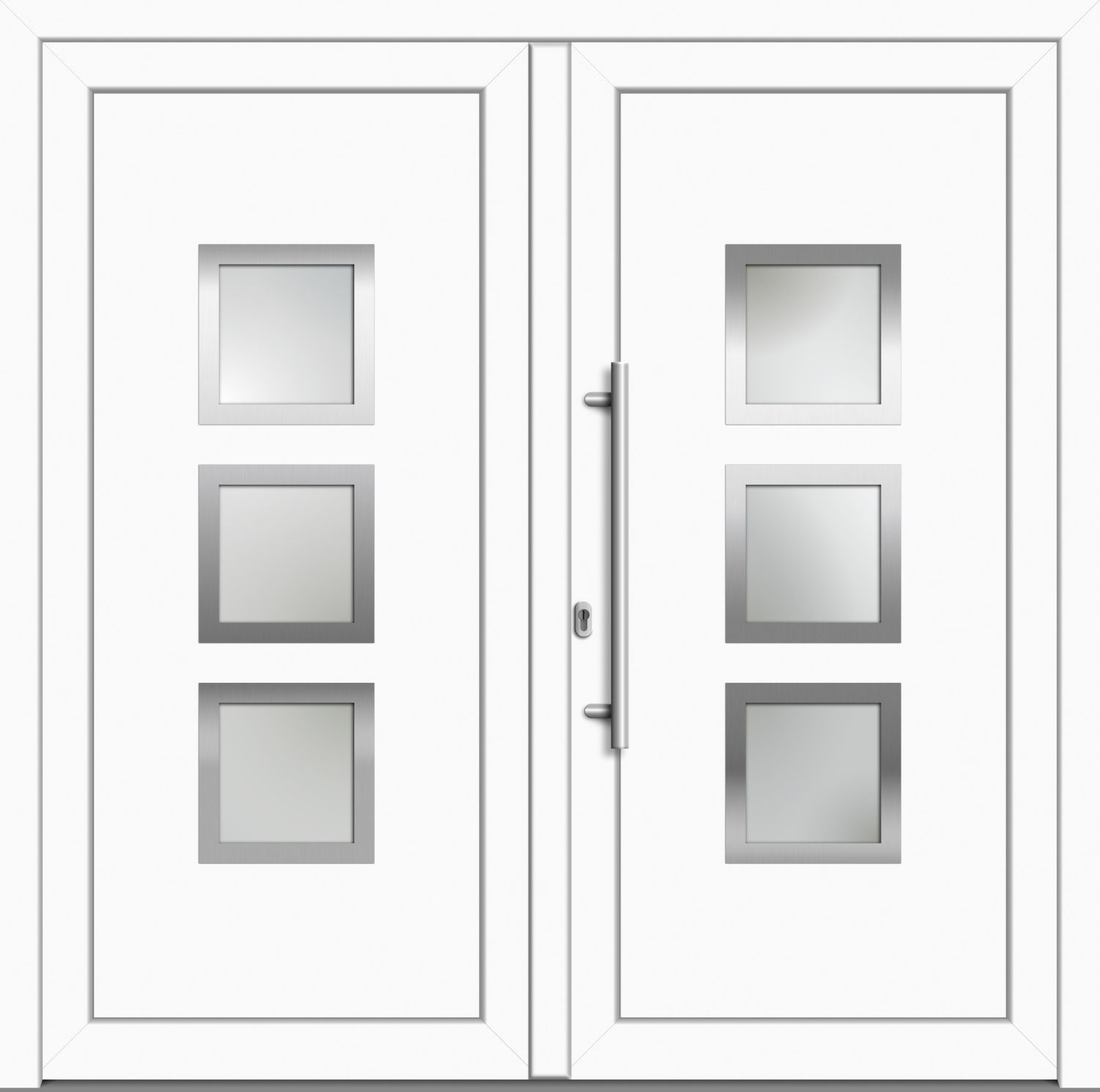 ‚Kunststoff Haustür „LORELEY“ 71 mm Doppeltür symm – Die perfekte Eingangstür für moderne Hauseingänge. Die weiße Doppeltür kann cm-genau nach Maß gefertigt werden und eignet sich somit für wirklich jedes Bauprojekt. Ausgestattet mit einer 5-fach Rollzapfenverriegelung oder 5-fach Pilzkopfverriegelung und Aushebelsicherung ist der Eingang zuverlässig abgesichert. Dank der Öffnung nach außen oder innen sind Sie flexibel im Einsatz und können zusätzlichen Stauraum schaffen. Die zweiflügelige Kunststofftür wird ohne Mittelsteg gerfertigt. Das sorgt für die Nutzung der vollen Breite und ermöglicht es die Tür mit Fahrzeugen zu passieren. Der moderne Charakter wird durch Edelstahl-Applikationen unterstrichen!‘