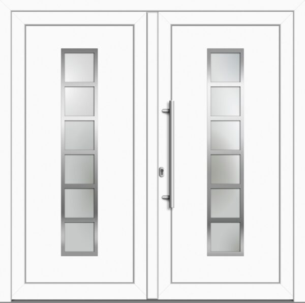 ‚Kunststoff Haustür „MILENA“ 71 mm Doppeltür symm – Die perfekte Eingangstür für moderne Hauseingänge. Die weiße Doppeltür kann cm-genau nach Maß gefertigt werden und eignet sich somit für wirklich jedes Bauprojekt. Ausgestattet mit einer 5-fach Rollzapfenverriegelung oder 5-fach Pilzkopfverriegelung und Aushebelsicherung ist der Eingang zuverlässig abgesichert. Dank der Öffnung nach außen oder innen sind Sie flexibel im Einsatz und können zusätzlichen Stauraum schaffen. Die zweiflügelige Kunststofftür wird ohne Mittelsteg gerfertigt. Das sorgt für die Nutzung der vollen Breite und ermöglicht es die Tür mit Fahrzeugen zu passieren. Der moderne Charakter wird durch Edelstahl-Applikationen unterstrichen!‘