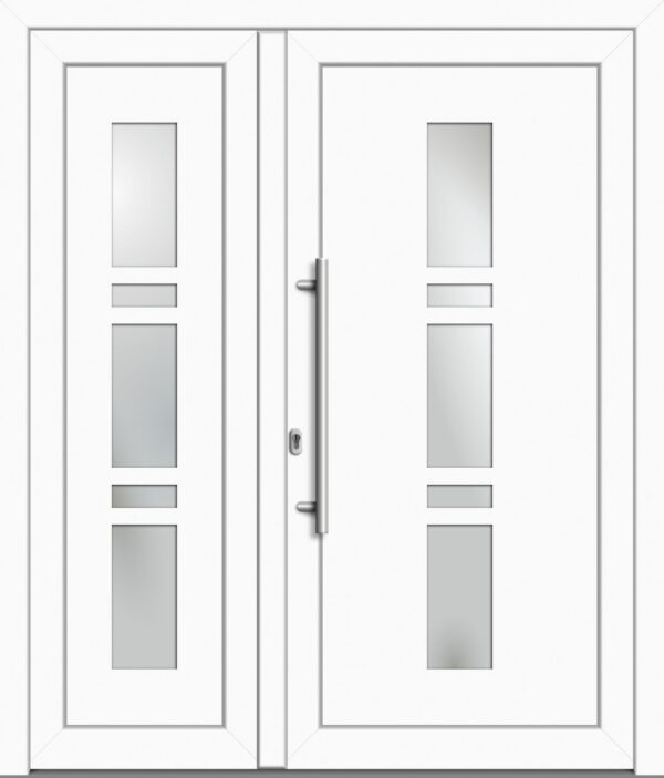 ‚Unsere Kunststoff Haustür „CHRISTA“ 71 mm Doppeltür asymm bietet Ihnen mehr Freiheit und Komfort für Ihren Hauseingansbereich. Die Doppeltür ist als Maßanfertigung verfügbar und kann cm-genau in einer Breite von 180 cm – 232 cm und eine Höhe von 180 cm – 232 cm produziert werden. Dies ermöglicht einen flexiblen Einsatz. Die großzügige Öffnung, ohne Mittelsteg, ermöglicht einen bequemen Durchgang für sperrige Gegenstände oder Fahrzeuge und schafft mehr Tageslicht. Die Glasfläche wird in Klarglas, Ornamentglas 504 oder Satinato (Milchglas) gefertigt und kann optional mit Sicherheitsglas produziert werden. Dank der 5-fach Rollzapfenverriegelung oder 5-fach Pilzkopfverriegelung pro Flügel und zusätzlicher Aushebelsicherung auf Bandseite ist Sicherheit garantiert. Das zeitlose Weiß passt zu nahezu jeder Fassade und lässt Ihren Eingangsbereich freundlich und einladend wirken.‘