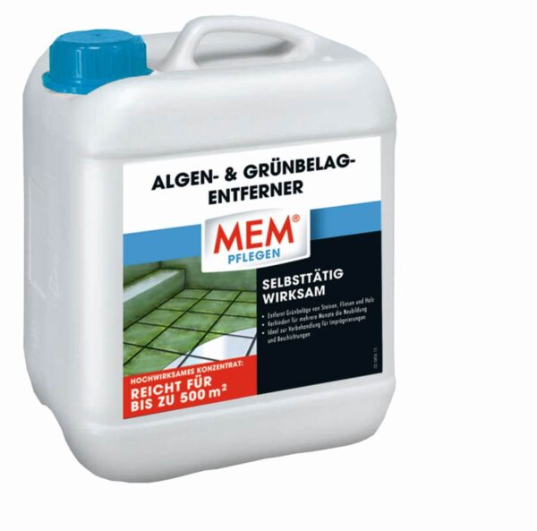 MEM Algen- & Grünbelag-Entferner ist ein hochwirksames Reinigungskonzentrat (1 Liter reicht für bis zu 100 m²), das selbsttätig tiefenwirksam Verschmutzungen von Natursteinpflaster, Betonsteinpflaster, Platten-Klinkerbelägen und Holz entfernt. Verhindert für mehrere Monate die Neubildung. Ideal zur Vorbehandlung für Imprägnierungen und Beschichtungen.