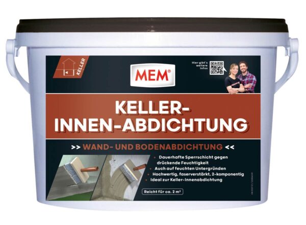 Zweikomponentige, kunststoffvergütete Abdichtung auf Zementbasis. MEM Keller-Innen-Abdichtung eignet sich auch hervorragend bei drückender Feuchte, für Wand- und Bodenflächen (begehbar).