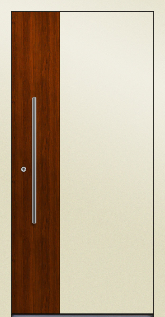 ‚Flügelüberdeckende RC2 Aluminium Haustür mit Holzdekor. Dieses Modell cm-genau auf Maß und in 32 Farben bestellen. Ausgestattet mit sicherer Schwenkhakenverriegelung, Edelstahl-Stoßgriff & Tagesfalle ‚