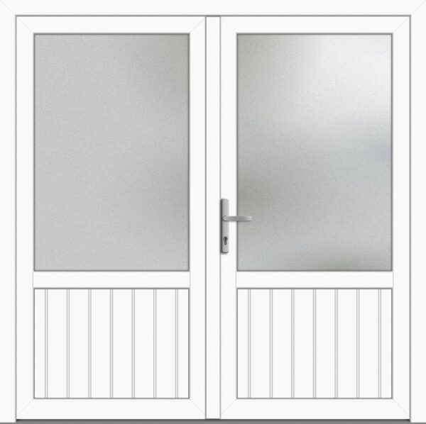 ‚Zweiflügelige Nebeneingangstür aus Kunststoff mit Glas, Maßanfertigung cm-genau, Farben: Weiß, Holzdekor: , Sichere 5-fach Rollzapfenverriegelung, 3-fach Schwenkhakenverriegelung oder 5-fach Schwenkhakenverriegelung, Öffnungsrichtung: außen oder innen, Doppeltür ohne Mittelsteg gefertigt, Breite: 160 cm bis 220 cm, Höhe: 180 cm bis 220 cm‘