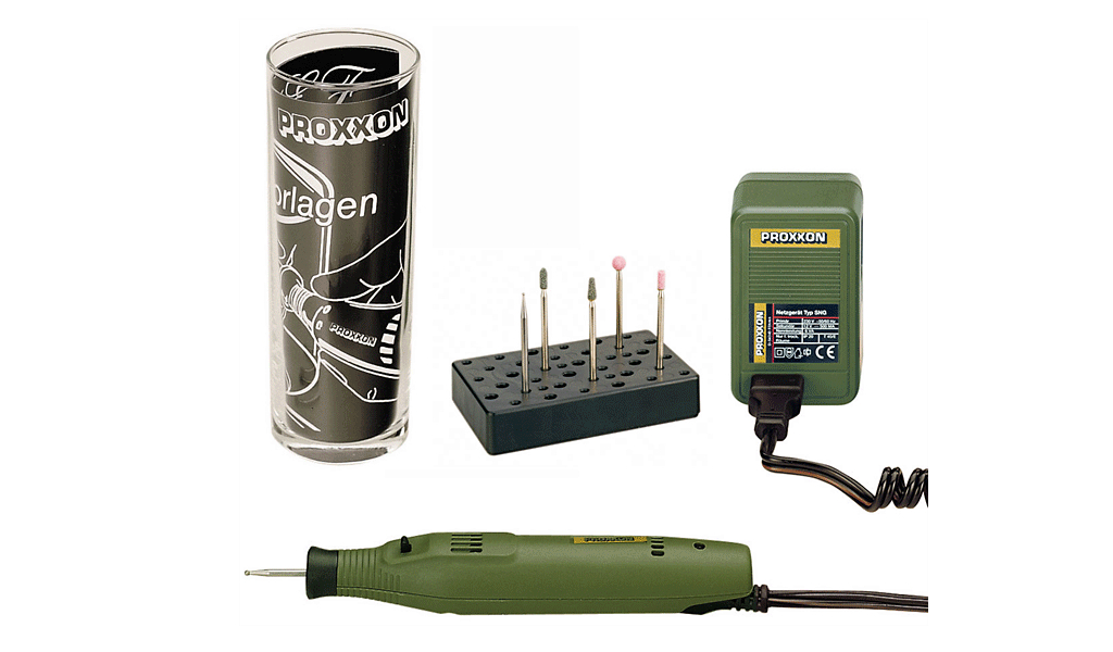 * Inklusive Probierglas und Graviervorlage Das extrem kompakte Graviergerät von PROXXON besitzt einen extrem leisen und langlebigen DC-Spezialmotor. Dazu gibt es ein Netzgerät, ein Probierglas, Vorlagen und Anleitungsheft sowie alle notwendigen Einsatzwerkzeuge.