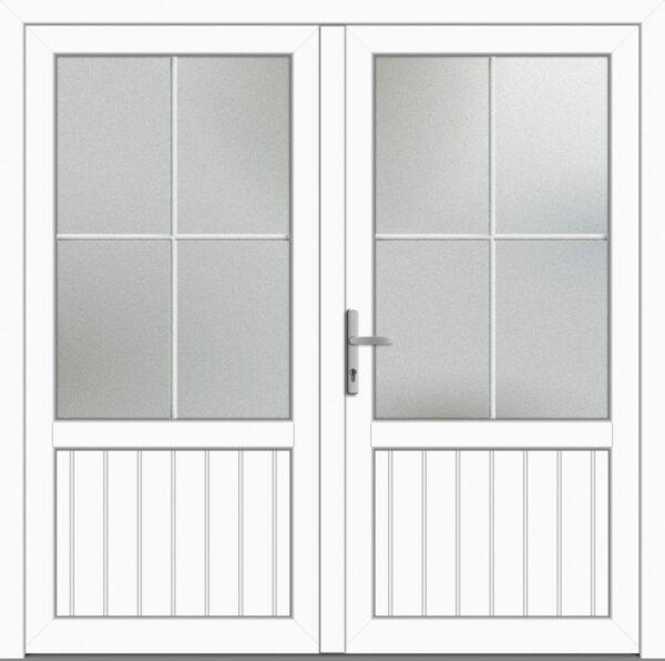 ‚Egal ob für Ihren Neubau oder eine Renovierung, unsere Kunststoff Nebeneingangstür „NICOLE“ 74 mm 2-flügelig symm 4 Sprossenfelder mit genuteten Türblättern eignet sich hervorragend für Häuser im klassischen Stil. Das Profilsystem GEALAN S 8000 sorgt für eine solide Wärmedämmung und Stabilität. Die charakteristische Sprossenverglasung und die strahlende Oberfläche in Weiß RAL 9016 lässt Ihre Stall, Hobbyraum oder Carport zum Blickfang werden. Die innenliegenden Sprossen erleichtern die Reinigung der Glasflächen ungemein. Bei der Glasart stehen Ihnen Mastercarré-Glas, Klarglas, Ornamentglas 504 oder Satinato (Milchglas) mit der Option auf Sicherheitsglas zur Auswahl. In Puncto Sicherheit sorgt eine 5-fach Rollzapfenverriegelung oder 3-fach Schwenkhakenverriegelung mit zusätzlicher Aushebelsicherung für ein beruhigtes Gefühl in Ihrem Eigenheim. Kunststoff ist ein flexibeler Rohstoff, der es ermöglicht die Doppeltür NICOLE auf Maß zu fertigen. Hier stehen Ihnen folgende Maximalmaße zur Konfiguration bereit: Breite 160 cm bis 230 cm und Höhe 192 cm bis 225 cm. Dank der Bauweise ohne Mittelsteg (Stulp) lassen sich die Türflügel komplett öffnen, sodass man sogar genügend Platz zum Durchqueren mit Fahrzeugen hat. Abgerundet durch ein passendes Griffset haben Sie sich eine individuell und voll funktionstüchtige Tür konfiguriert!‘