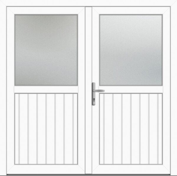 ‚Die PVC Nebeneingangstür „STEFANIE“ 74 mm symm eignet sich als zentimetergenaue Tür hervorragend für Bauprojekt, bei der eine breite Tür für Nebeneingänge wie Scheune, Keller oder Carport gesucht wird. Dank der Verwendung des Materials Kunststoff, lässt sich die Tür dabei nicht nur leicht pflegen, sondern bietet auch ein ausgezeichnetes Preis-Leistungs-Verhältnis. Die Doppeltür STEFANIE 74 mm wird in einem frische und zeitlosen Weiß gefertigt. Somit eignet sich unsere PVC Nebeneingangstür „STEFANIE“ 74 mm symm sowohl für Neubauten, als auch für klassische Altbauhäuser. Zudem besteht die Möglichkeit einer cm-genauen Maßanfertigung. Hierfür wählen Sie einfach aus einer Breite von 160 cm bis 230 cm und einer Höhe zwischen 192 cm bis 225 cm Ihre Maßanfertigung aus. Um Ihren Eingangsbereich optimal zu sichern, wird eine 5-fach Rollzapfenverriegelung oder 3-fach Schwenkhakenverriegelung verbaut. Dank des großzügigen Glasausschnittes in der Türfüllung, spendet dieses Modell zusätzliches Tageslicht. Hier können Sie aus den Glasarten Mastercarré-Glas, Klarglas, Ornamentglas 504 oder Satinato (Milchglas) auswählen. Bestellen Sie jetzt die optimale Konfiguration und Qualität Made in Germany für Ihren Nebeneingangsbereich!‘