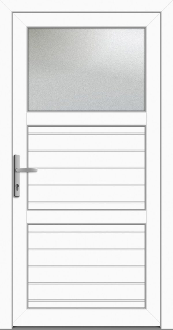 ‚Kunststoff Nebeneingangstür „JOSEFINE“ 74 mm mit Flachnuten-Design außen perfekt für Hobbyraum, Werkstatt oder Stallung. Die Kunststofftür nach Maß kann individuell in den Größen: Breite 80 cm – 115 cm und Höhe 183 cm – 225 cm konfiguriert werden. Das GEALAN S 8000 Profilsystem überzeugt durch eine gute Wärmedämmung von 1,30 W/m²K. Ausgestattet mit einer 5-fach Rollzapfenverriegelung oder 3-fach Schwenkhakenverriegelung plus Aushebelsicherung überzeugt die Nebeneingangstür auch in Puncto Sicherheit. Gefertigt in der klassische Farbe Weiß RAL 9016 fügt sich die PVC Nebeneingangstür „JOSEFINE“ 74 mm optimal in ihre Umgebung ein. Weitere Varianten zur Auswahl sind die Verglasung in Mastercarré-Glas, Klarglas, Ornamentglas 504 oder Satinato (Milchglas), die Öffnungsrichtung nach außen oder innen und das passende Griffset. Das passende Zubehör im Online-Konfigurator rundet die Nebeneingangstür ab!‘