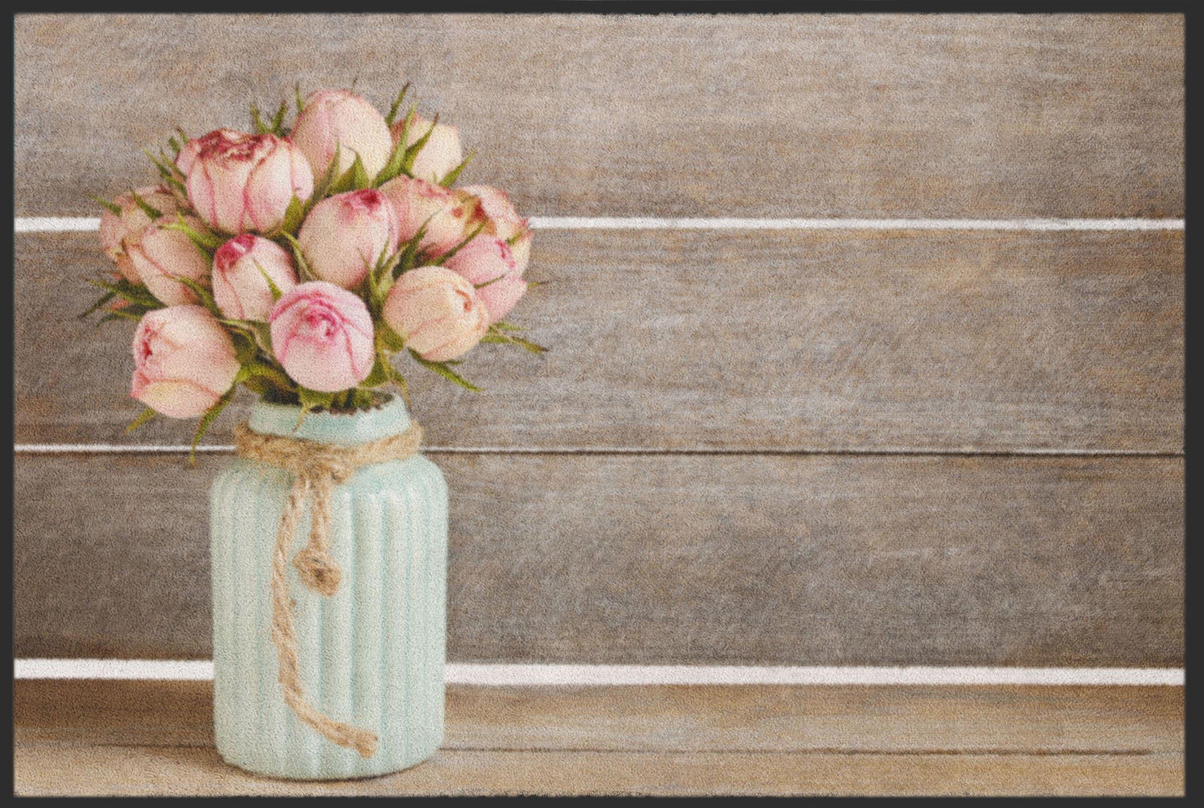 Mit dieser Sauberlaufmatte Rosen 4240 zaubern Sie nicht nur Ihren Besuchern ein Laecheln ins Gesicht. Diese sehr hochwertige Tuermatte ist reissfest, knitterfrei, waschbar. Da sie mit 7 mm Gesamthoehe sehr flach ist, passt sie unter fast jede Tuer. Die Sauberlaufmatte ist Schadstoffgeprueft und fuer Allergiker geeignet. Sie erhalten 5 Jahre Herstellergarantie.. Pflegetipps: Waschen Sie die Sauberlaufmatte Rosen 4240 separat bei 60Grad Temperatur mit Feinwaschmittel, schleudern diese auf niedriger Stufe, dadurch richten sich die Fasern auf, der Mattenflor wird aktiviert und transportbedingte Falten und Knicke werden wieder glatt. Pflegen Sie so Ihre Sauberlaufmatte regelmaessig und Sie werden ueberrascht sein, wie viele Jahre Qualitaet und Farbe erhalten bleiben.