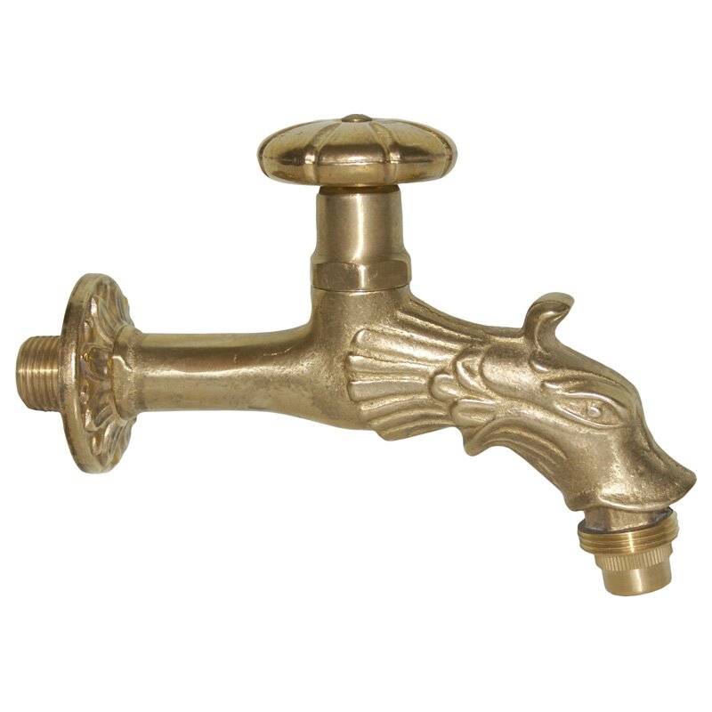Nostalgie Auslaufventil „Drachenkopf“ Auslauf mit Zentrierstern und Wandrosette MS-poliert mit wunderschönem Drachenmotiv DN15
