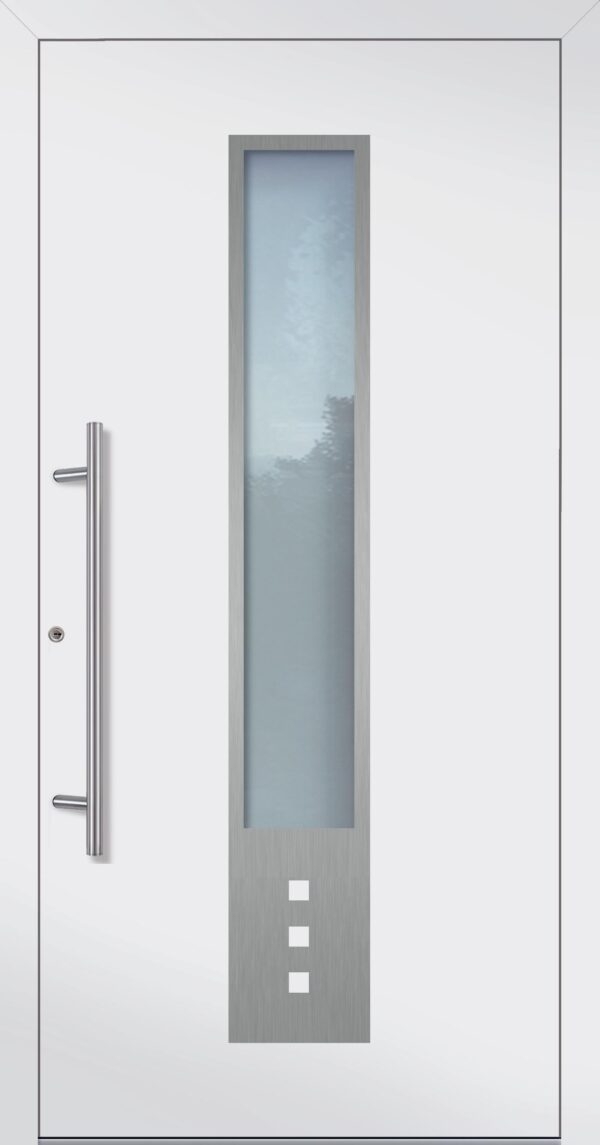 ‚Aluminium Eingangstür nach Maß „GLORIA“ mit Edelstahl-Applikationen außen smarte Funktion: Fingerscanner, Digitaler Türspion oder Codetaster Profil: GT 190 Arcade Wärmedämmung: 0,80 W/m²K Widerstandsklasse RC2 Farben: Weiß, Anthrazitgrau, Weinrot, Graualuminium, Anthrazitgrau/Eisenglimmer, Dunkelbraun oder Weißaluminium beidseitig flügelüberdeckend‘