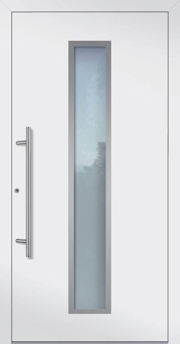 ‚Aluminium Eingangstür nach Maß „SVENJA“ mit Edelstahl-Applikationen außen smarte Funktion: Fingerscanner, Digitaler Türspion oder Codetaster Profil: GT 190 Arcade Wärmedämmung: 0,80 W/m²K Widerstandsklasse RC2 Farben: Weiß, Anthrazitgrau, Weinrot, Graualuminium, Anthrazitgrau/Eisenglimmer, Dunkelbraun oder Weißaluminium beidseitig flügelüberdeckend‘